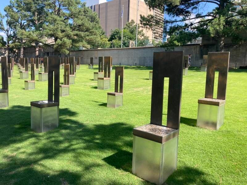 Staying in Oklahoma City we decided to visit the memorial for the 168 people who died in the bombing. Beautifully laid out and a moving monument to them. The chairs are positioned in line with the floors where they perished.